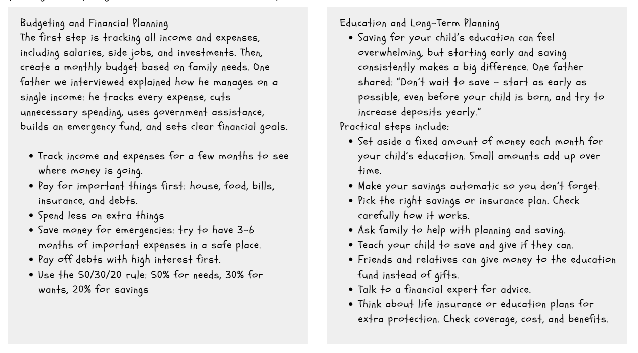 The first step is tracking all income and expenses, including salaries, side jobs, and investments. Then, create a monthly budget based on family needs. One father we interviewed explained how he manages on a single income: he tracks every expense, cuts unnecessary spending, uses government assistance, builds an emergency fund, and sets clear financial goals.